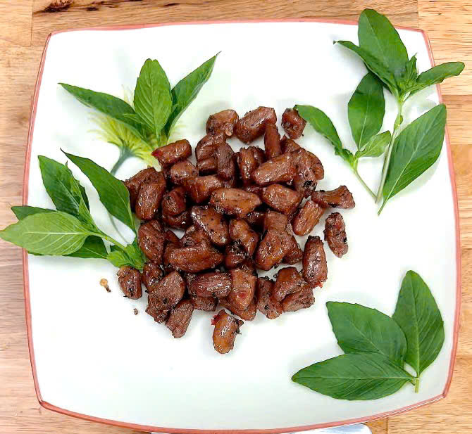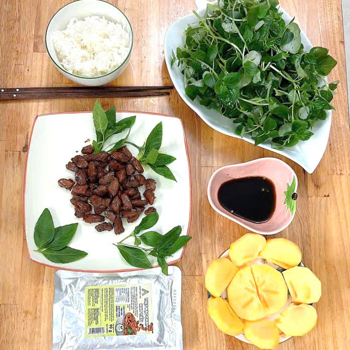 Gia vị chay: Tiêu (1.1%), đường, hạt nêm chay, nước mắm chay, ớt tươi, dầu đậu nành, hành tím, nước.